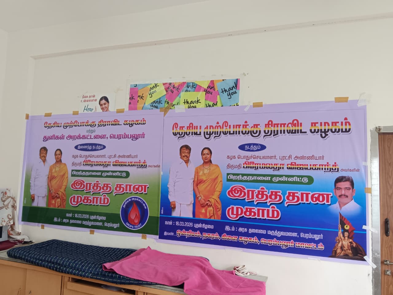 18-03-2026 அன்று திருமதி.பிரேமலதா விஜயகாந்த் அவர்களின் பிறந்தநாள் முன்னிடு துளிகள் அறக்கட்டடளை மற்றும் தேசிய முற்போக்கு திராவிட கழகம் இணைந்து இரத்த தானம் முகாம் பெரம்பலூர் அரசு தலைமை மருத்துவமனையில் நடத்தப்பட்டது. இதில் சுமார் 20 நபர்கள் தங்களின் இரத்தத்தை இரத்த தானம் செய்தனர்.