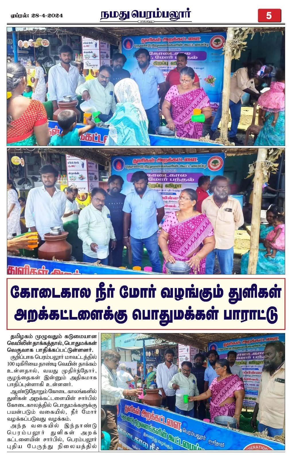 2024 ஆம் ஆண்டு பெரம்பலூர் புதிய பேருந்துநிலையத்தில் நீர்மோர் பந்தல் துளிகள் அறக்கட்டளை சார்பாக 40 நாள்கள் வழங்கப்பட்டது.